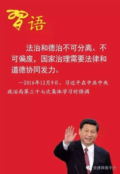 习近平在主持学习时强调,法律是准绳,任何时候都必须遵循;道德是基石,任何时候都不可忽视。在新的历史条件下,我们要把依法治国基本方略、依法执政基本方式落实好,把法治中国建设好,必须坚持依法治国和以德治国相结合,使法治和德治在国家治理中相互补充、相互促进、相得益彰,推进国家治理体系和治理能力现代化。