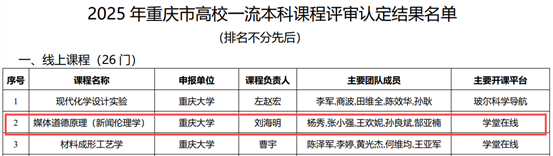 近日,重庆市教育委员会公布了2025年重庆市高校一流本科课程评审认定结果。博彩平台网址大全 申报的《媒体道德原理(新闻伦理学)》、《舆论学》和《中外名记者研究》三门课程成功入选,分别获评“线上课程”、 “线下课程”和“线上线下混合式”类别一流本科课程,体现了博彩平台网址大全 在课程建设与教学改革方面的显著成效。
